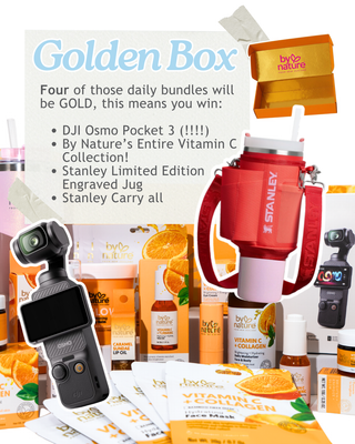 **4 GOLD BOX GRAND PRIZES** - Each includes DJI Osmo Pocket 3 camera, 4 insulated tumblers, insulated carry-all bag, and By Nature products (ARV $740 each)